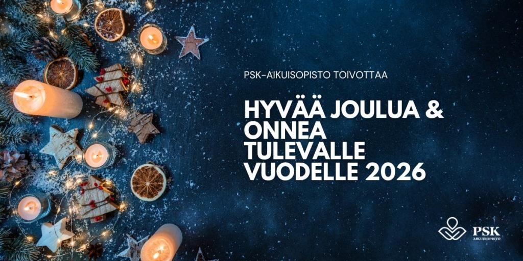 Jouluviikolla opintotoimisto palvelee puhelimitse ja sähköpostilla maanantaina 22.12. ja tiistaina 23.12.2025 p. (08) 3120 711, toimisto@psk.fi. Joululomaa vietämme 24.12.2025 - 4.1.2026. Oppilaitos on suljettu myös loppiaisena 6.1.2026. PSK-Aikuisopiston väki toivottaa kaikille opiskelijoilleen ja yhteistyökumppaneilleen hyvää joulun aikaa!